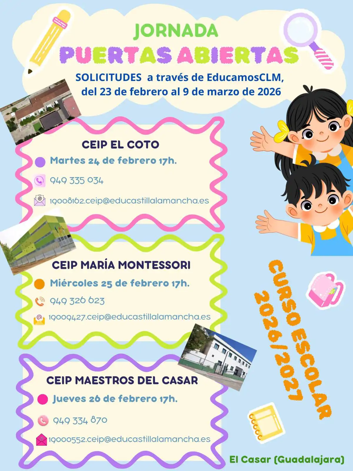 Para más información, puedes contactar directamente con el centro en el teléfono 949 326 623 o a través del correo electrónico 19009427.ceip@educastillalamancha.es